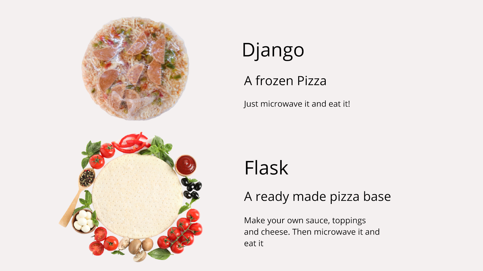 Django is like a frozen pizza. You get the pizza base, the sauce, the toppings and the grated cheese in one package and all your need is a microwave to satisfy your pizza craving.
