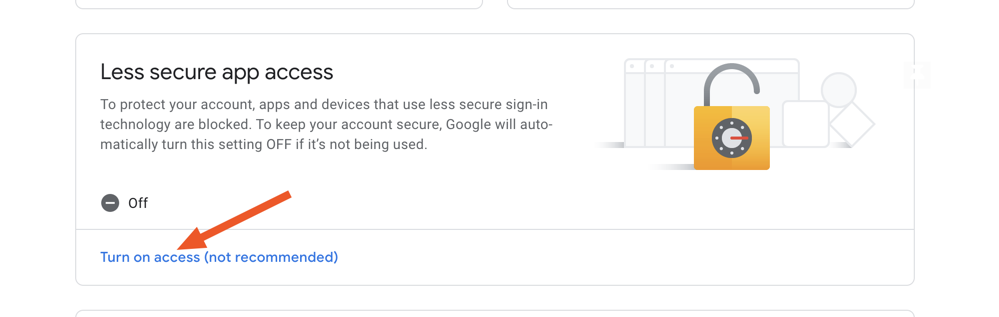 This method is not recommended as you can see from the “not recommended” text in the above image. It leads to security vulnerabilities, not to mention the fact that you have your gmail account password somewhere in your codebase.
