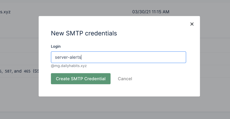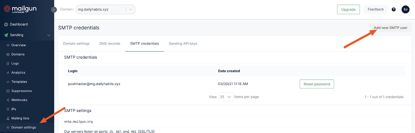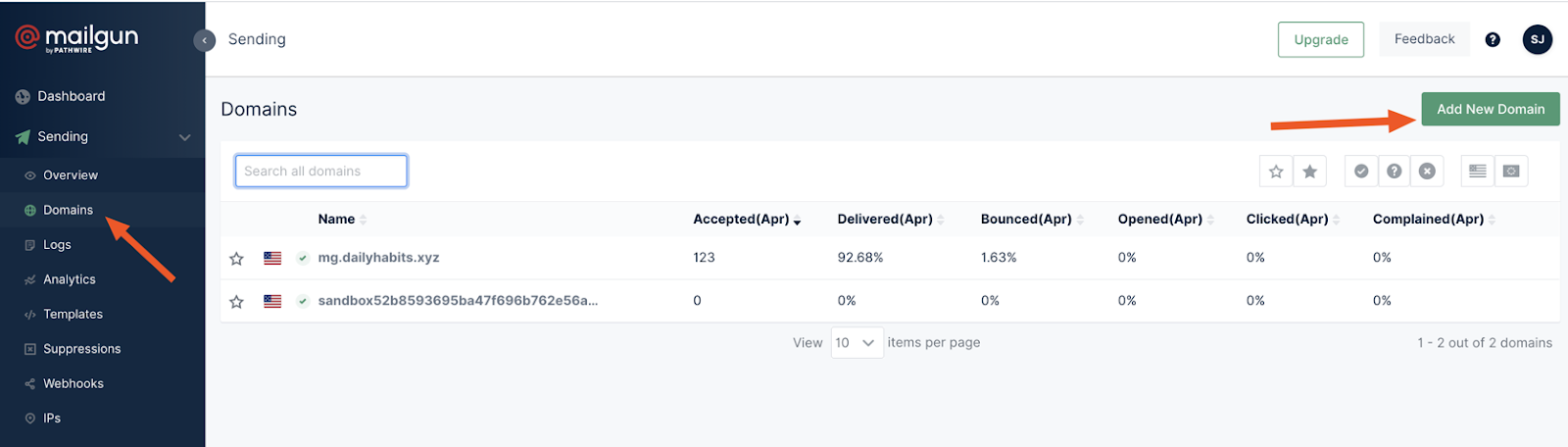 To send emails using mailgun, signup for an account on mailgun, and create a new domain. As you can see below, I have already set up a domain called dailyhabits.xyz which I own.