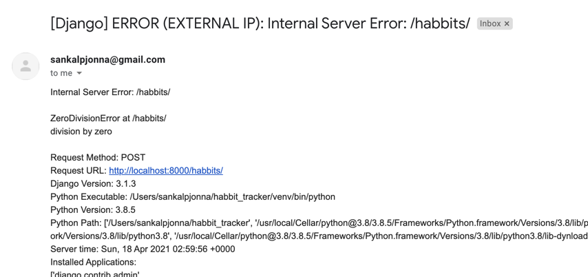 Fortunately, Django already thought of this and has a pretty straightforward mechanism to email yourself with exceptions using the ADMINS setting. Whenever an error occurs, if DEBUG is set to False, Django will email all the IDs mentioned in ADMINS.