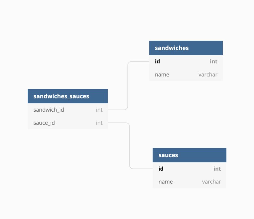 This is exactly what Django does under the hood when you use a ManyToManyField. It creates a through model which is not visible to the ORM user and whenever one needs to fetch all of the sandwiches that use a particular sauce given only the name of the sauce, the above 3 tables are joined.