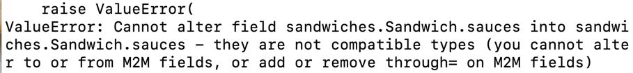 So far we have been adding sauces to the sandwich model but we can also go the other way round pretty easily. Django internally takes care of whatever database table entries need to be created to make this happen.