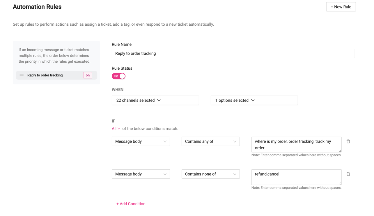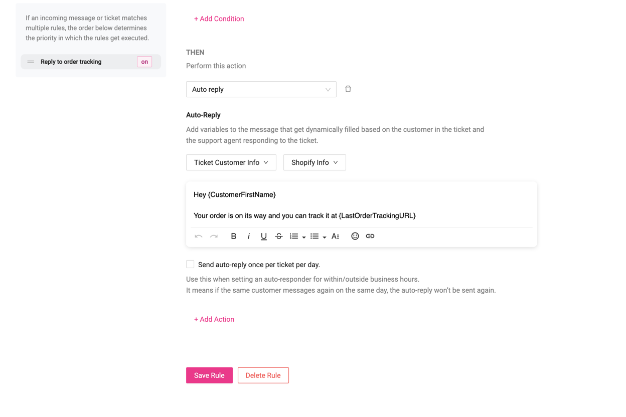 A large percentage of customer support queries are usually customers wanting to know where their order is and therefore there is no reason for a human to reply to queries like this when we have the API available to fetch the tracking URL of their last order.