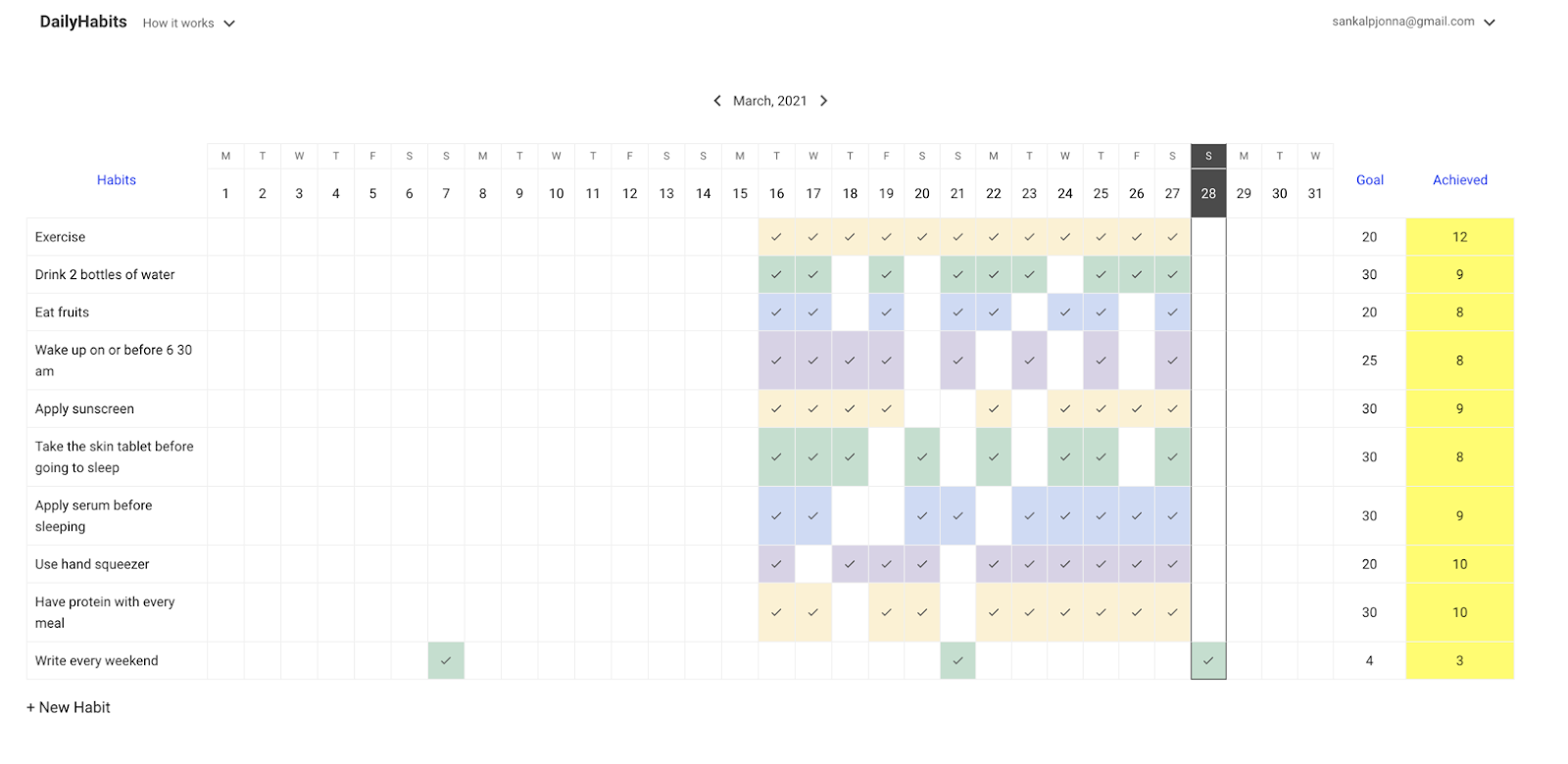 The idea was to make the simplest possible habit tracker that you can use on a web or mobile browser to keep track of habits such as exercising, waking up early, quitting a vice, etc.