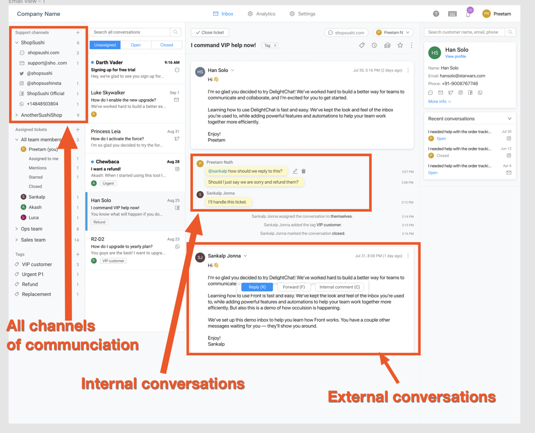 Customer support will happen via various channels like email, Facebook messenger, Twitter, WhatsApp etc, but our tool must also solve the problem of teammates communicating with each other while replying to support queries.