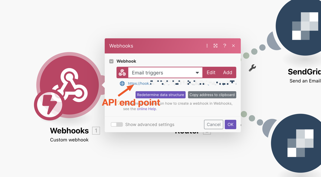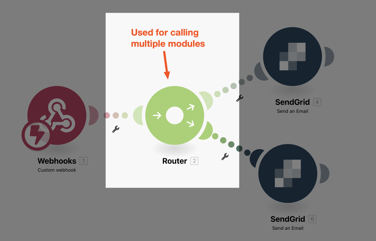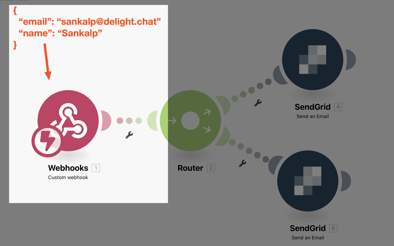 Create a router module and connect it to the webhook module. This is required because there will be multiple emails to be sent when the webhook is called.