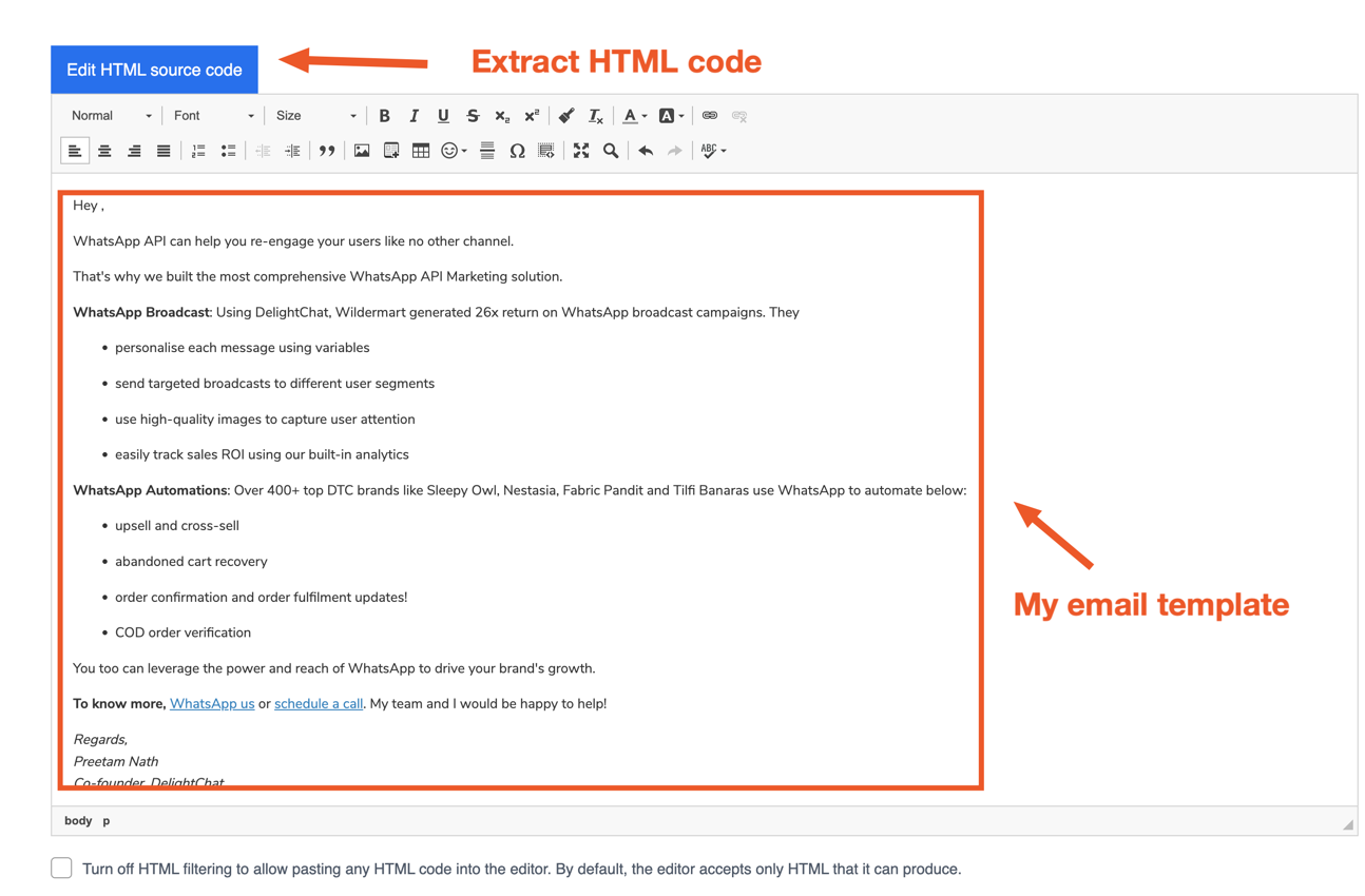 Once I finished composing the email, I extracted the HTML source code. You can use any editor that allows rich text as long as you are able to extract the HTML code once you are done.