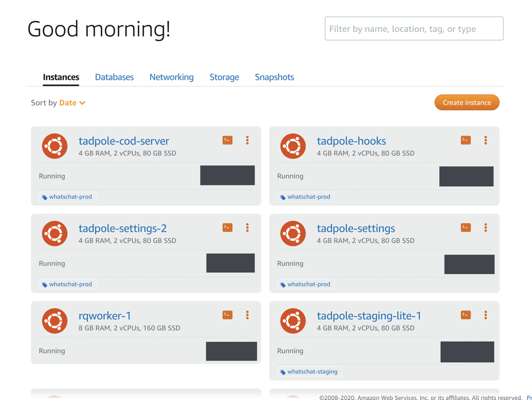 Once again our saviour was Lightsail which provides managed Databases with a fixed storage at very cheap prices. Only MySQL and PostgreSQL are available though which was fine with us since I am quite comfortable with MySQL. We have currently provisioned one MySQL DB with 2 vCPUS, 4GB RAM and 120GB SSD and it costs us 60$ a month.