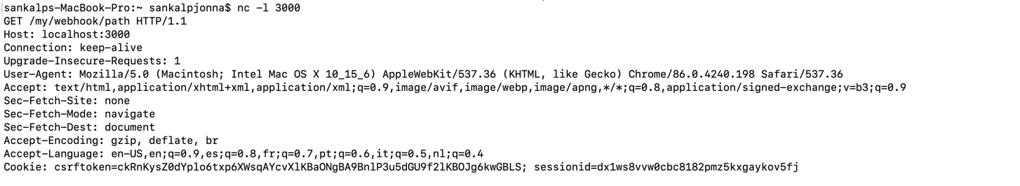 This command will listen for any requests coming on the port 3000 and display it on the terminal itself. Let us try it out by entering http://localhost:3000/my/webhook/path on the browser and see what happens.